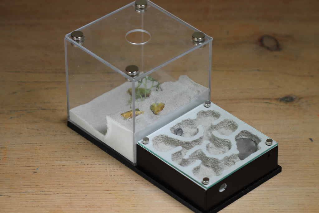 The Fallen Fortress is a new formicarium design from Tar Heel Ants. This design for your ant colonies features a 4x4x4" foraging area magnetically attached to the back of a 4x4x2 inch nest. This is a very similar design to our popular Fortress formicarium.