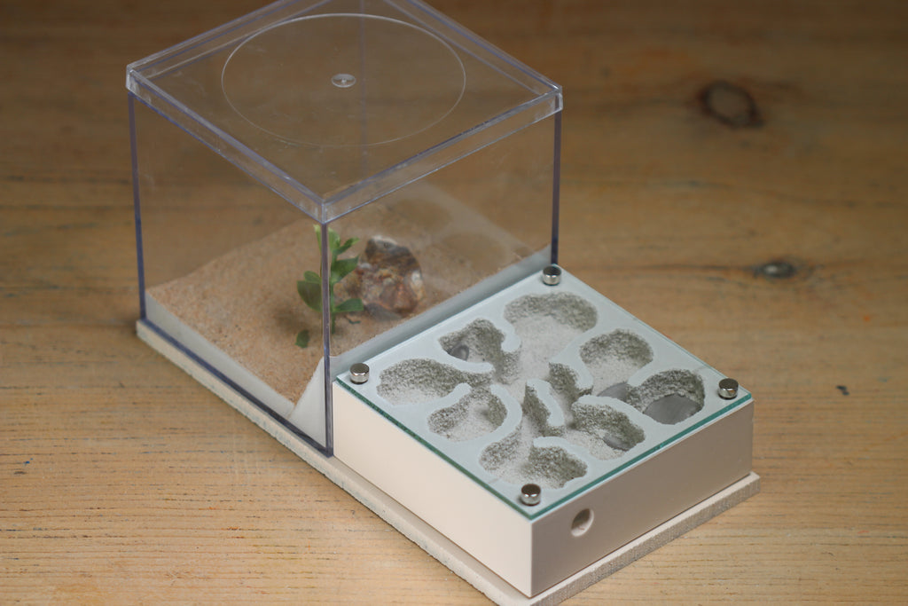 The Fallen Fortress is a new formicarium design from Tar Heel Ants. This design for your ant colonies features a 4x4x4" foraging area magnetically attached to the back of a 4x4x2 inch nest. This is a very similar design to our popular Fortress formicarium.