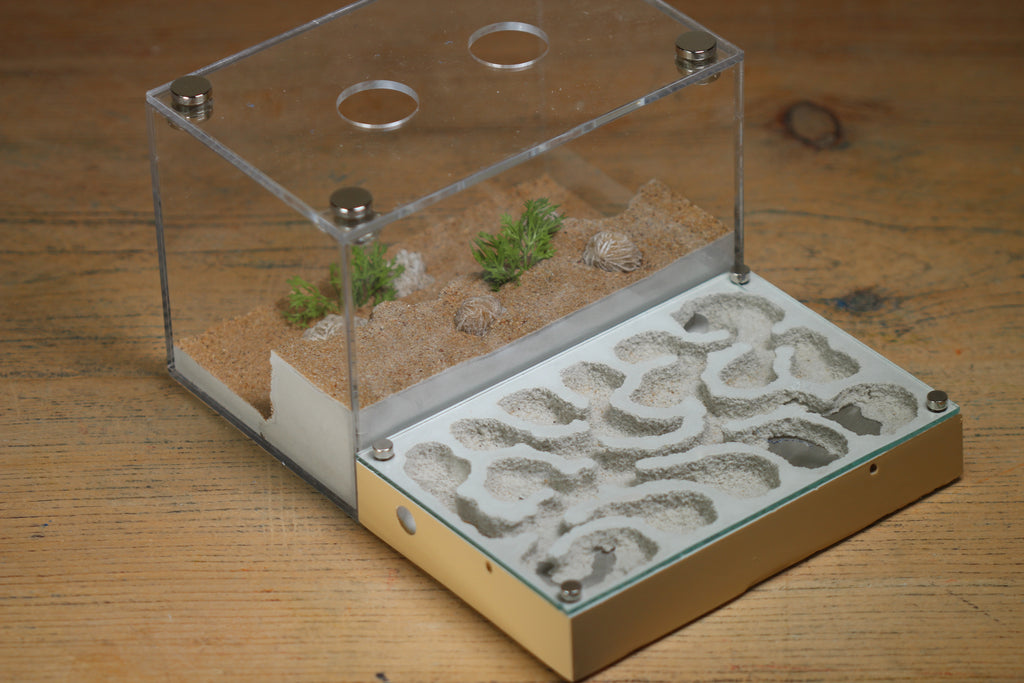 This smaller version of the Labyrinth formicarium. The Mini Labyrinth formicarium is a 4"x6" (100mmx150mm) formicarium attached magnetically (as well as by a small vinyl tubing insert) to the accompanying foraging area. The nest is completely removable from the foraging area for easy maintenance.