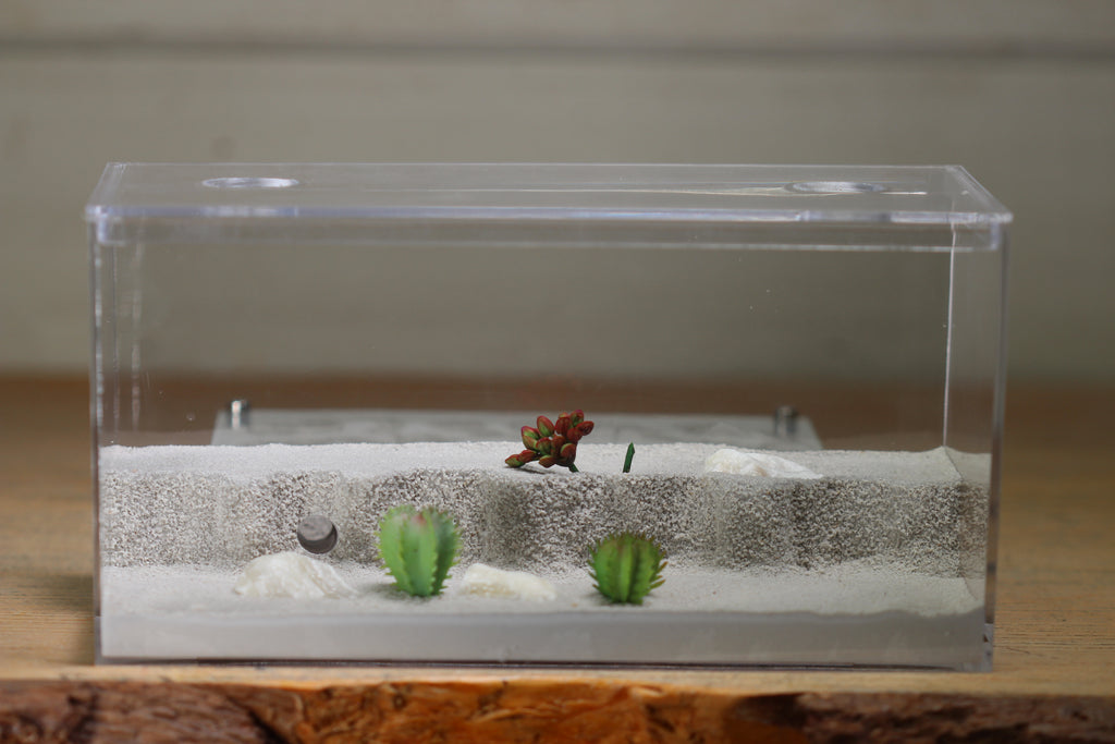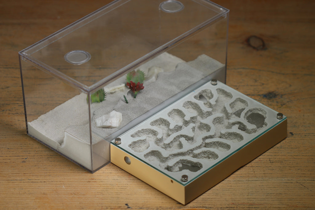 This smaller version of the Labyrinth formicarium. The Mini Labyrinth formicarium is a 4"x6" (100mmx150mm) formicarium attached magnetically (as well as by a small vinyl tubing insert) to the accompanying foraging area. The nest is completely removable from the foraging area for easy maintenance.
