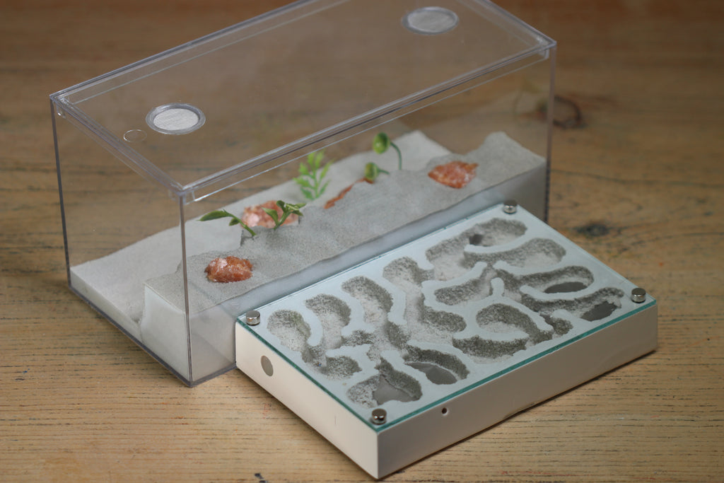 This smaller version of the Labyrinth formicarium. The Mini Labyrinth formicarium is a 4"x6" (100mmx150mm) formicarium attached magnetically (as well as by a small vinyl tubing insert) to the accompanying foraging area. The nest is completely removable from the foraging area for easy maintenance.