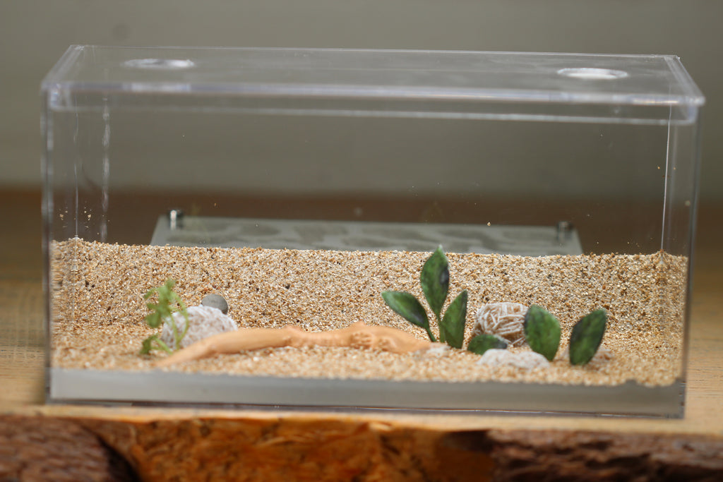 This smaller version of the Labyrinth formicarium. The Mini Labyrinth formicarium is a 4"x6" (100mmx150mm) formicarium attached magnetically (as well as by a small vinyl tubing insert) to the accompanying foraging area. The nest is completely removable from the foraging area for easy maintenance.