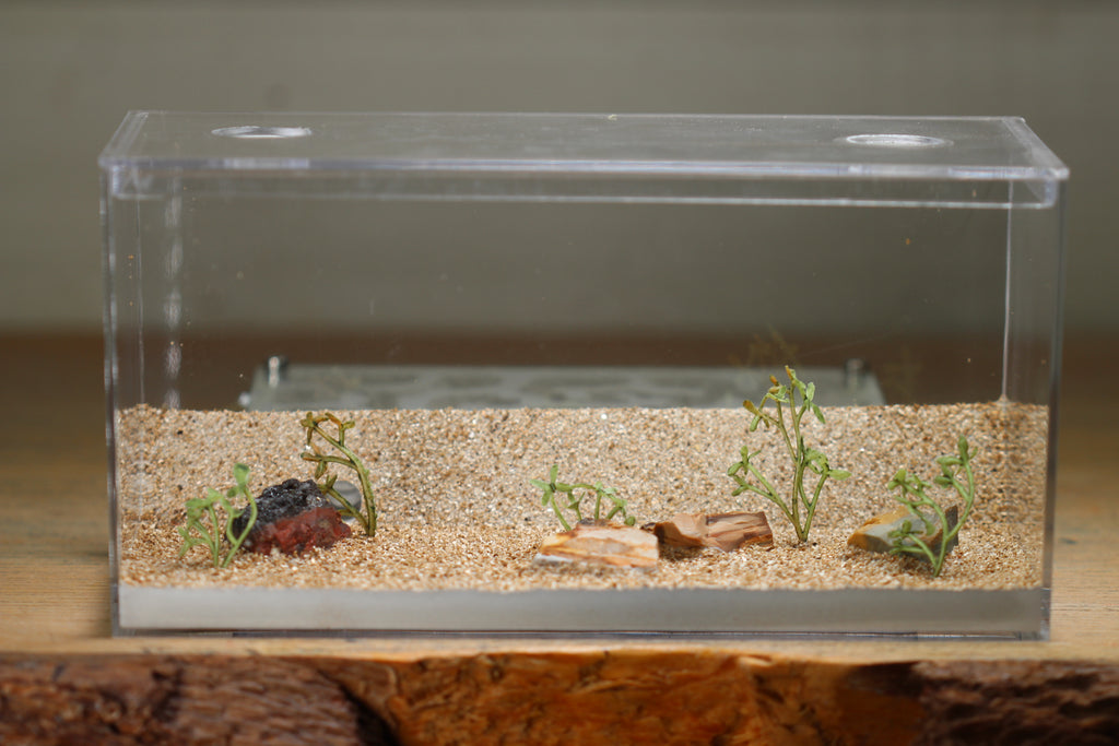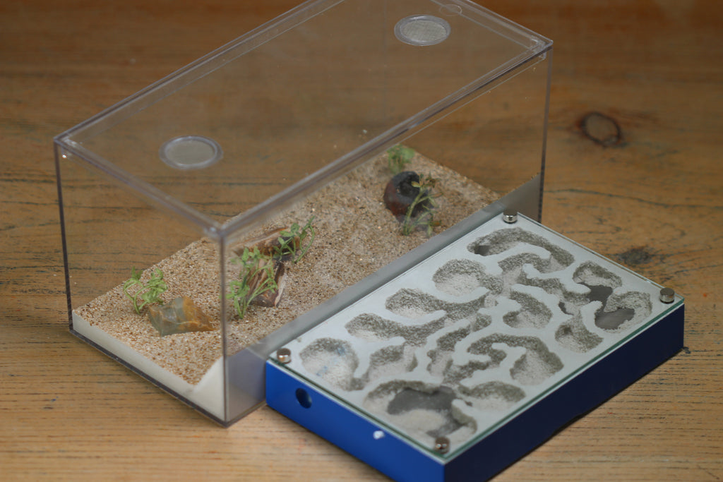 This smaller version of the Labyrinth formicarium. The Mini Labyrinth formicarium is a 4"x6" (100mmx150mm) formicarium attached magnetically (as well as by a small vinyl tubing insert) to the accompanying foraging area. The nest is completely removable from the foraging area for easy maintenance.