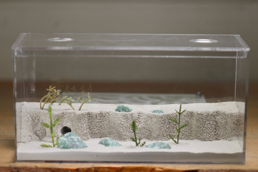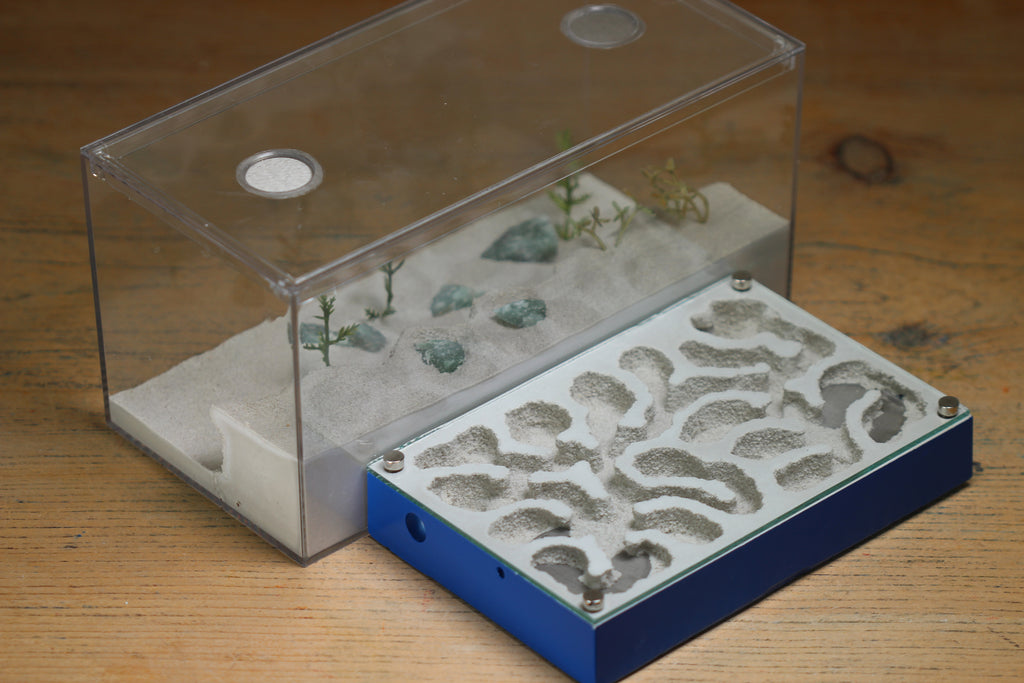 This smaller version of the Labyrinth formicarium. The Mini Labyrinth formicarium is a 4"x6" (100mmx150mm) formicarium attached magnetically (as well as by a small vinyl tubing insert) to the accompanying foraging area. The nest is completely removable from the foraging area for easy maintenance.