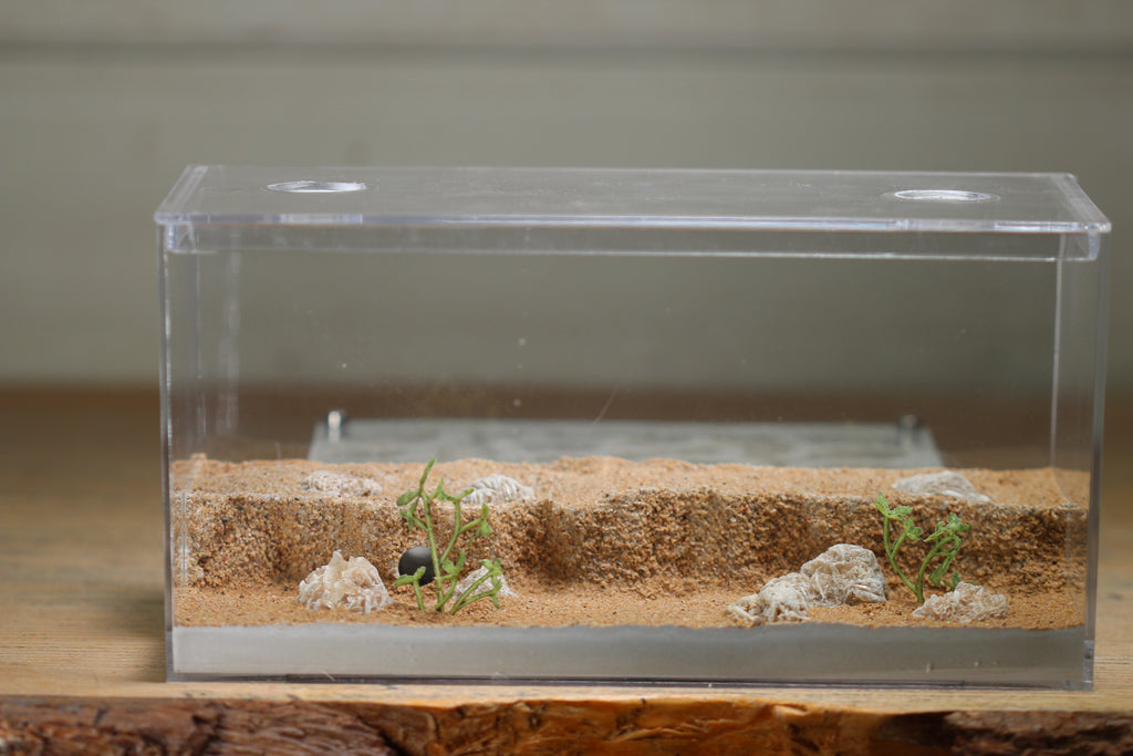 This smaller version of the Labyrinth formicarium. The Mini Labyrinth formicarium is a 4"x6" (100mmx150mm) formicarium attached magnetically (as well as by a small vinyl tubing insert) to the accompanying foraging area. The nest is completely removable from the foraging area for easy maintenance.