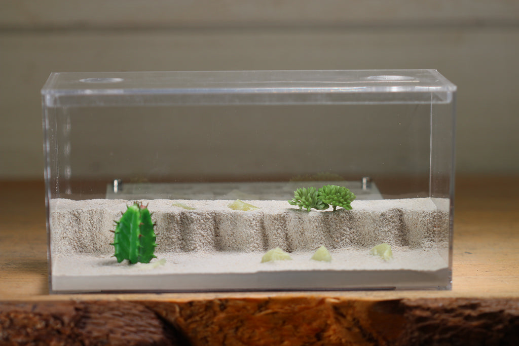 The Mini Labyrinth is a "top-down" or horizontal style formicarium from Tar Heel Ants. The Mini Labyrinth formicarium is a 4"x6" (100mmx150mm) formicarium attached magnetically (as well as by a small vinyl tubing insert) to the accompanying foraging area which is 4x8 (100 x 200mm). This formicarium (ant farm) from Tar Heel Ants is intended to be used for medium-sized colonies in their 2nd or 3rd year (with exceptions) and is fully expandable through the use of two ports.