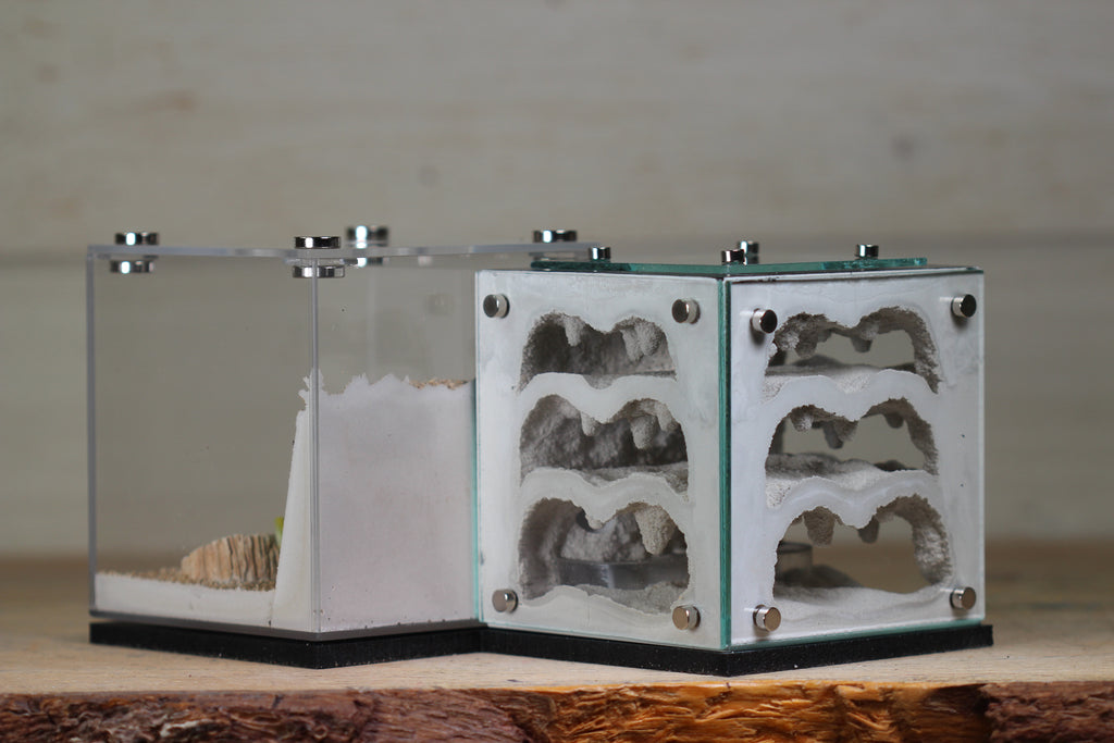 Camponotus spp. - Larger ants typically, our colonies have always utilized the ceilings of formicaria to hang upside-down. This design provides two larger 4x4 caverns for this activity and 4 viewing sides to view these ants hanging from.