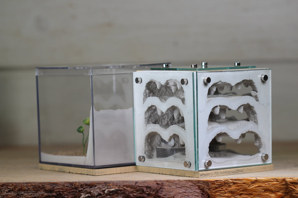 Camponotus spp. - Larger ants typically, our colonies have always utilized the ceilings of formicaria to hang upside-down. This design provides two larger 4x4 caverns for this activity and 4 viewing sides to view these ants hanging from.