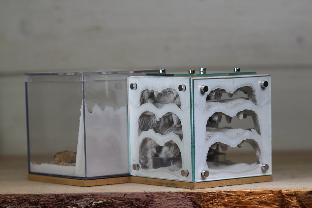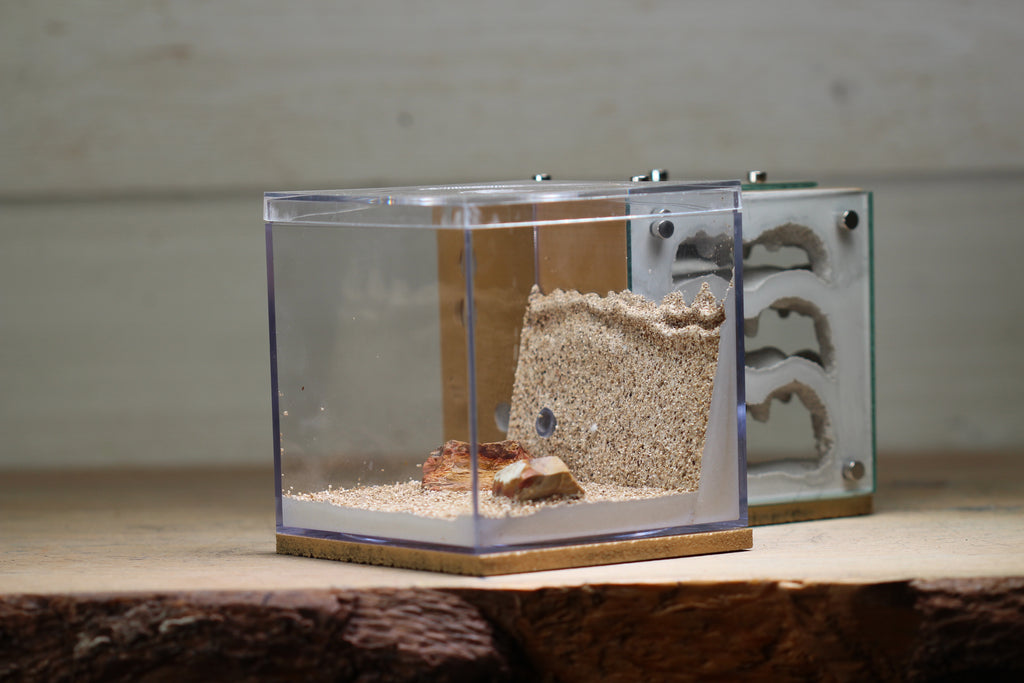 Camponotus spp. - Larger ants typically, our colonies have always utilized the ceilings of formicaria to hang upside-down. This design provides two larger 4x4 caverns for this activity and 4 viewing sides to view these ants hanging from.