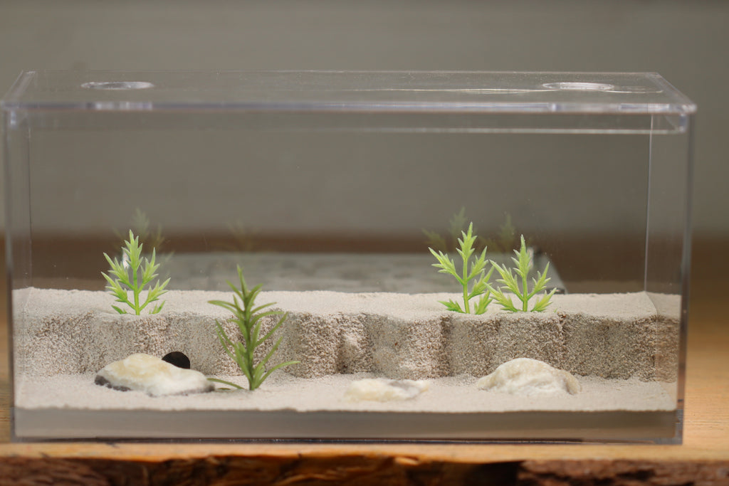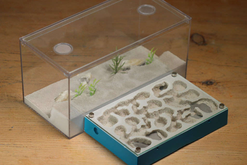 This smaller version of the Labyrinth formicarium. The Mini Labyrinth formicarium is a 4"x6" (100mmx150mm) formicarium attached magnetically (as well as by a small vinyl tubing insert) to the accompanying foraging area. The nest is completely removable from the foraging area for easy maintenance.