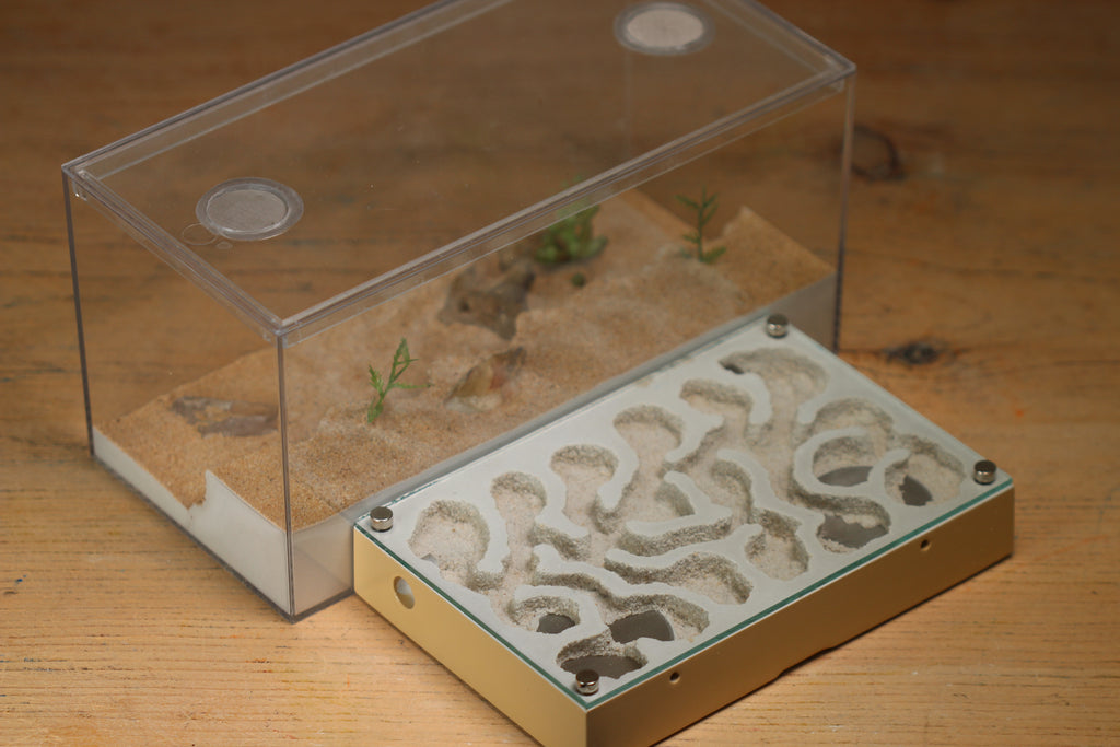 This smaller version of the Labyrinth formicarium.  The Mini Labyrinth formicarium is a 4"x6" (100mmx150mm) formicarium attached magnetically (as well as by a small vinyl tubing insert) to the accompanying foraging area.  The nest is completely removable from the foraging area for easy maintenance.