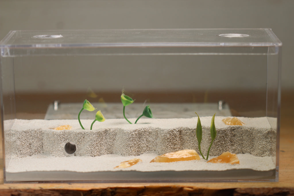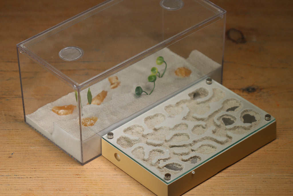 This smaller version of the Labyrinth formicarium.  The Mini Labyrinth formicarium is a 4"x6" (100mmx150mm) formicarium attached magnetically (as well as by a small vinyl tubing insert) to the accompanying foraging area.  The nest is completely removable from the foraging area for easy maintenance.