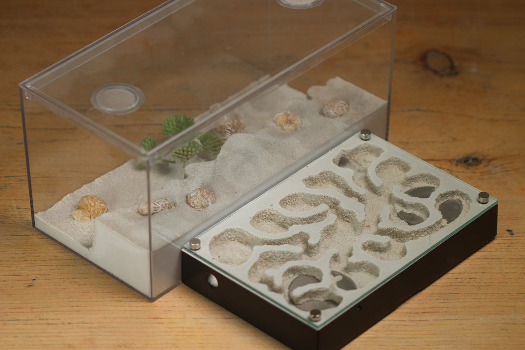 This smaller version of the Labyrinth formicarium.  The Mini Labyrinth formicarium is a 4"x6" (100mmx150mm) formicarium attached magnetically (as well as by a small vinyl tubing insert) to the accompanying foraging area.  The nest is completely removable from the foraging area for easy maintenance.