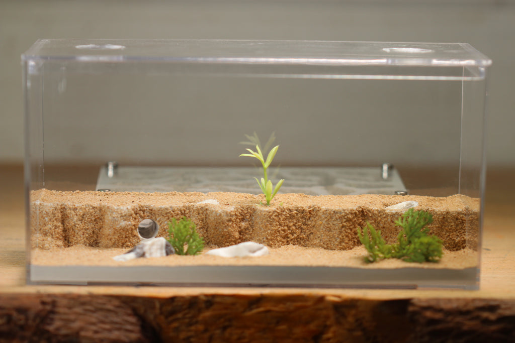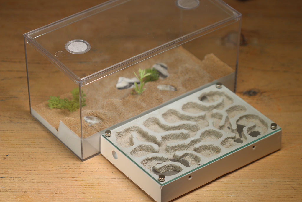 This smaller version of the Labyrinth formicarium. The Mini Labyrinth formicarium is a 4"x6" (100mmx150mm) formicarium attached magnetically (as well as by a small vinyl tubing insert) to the accompanying foraging area. The nest is completely removable from the foraging area for easy maintenance.