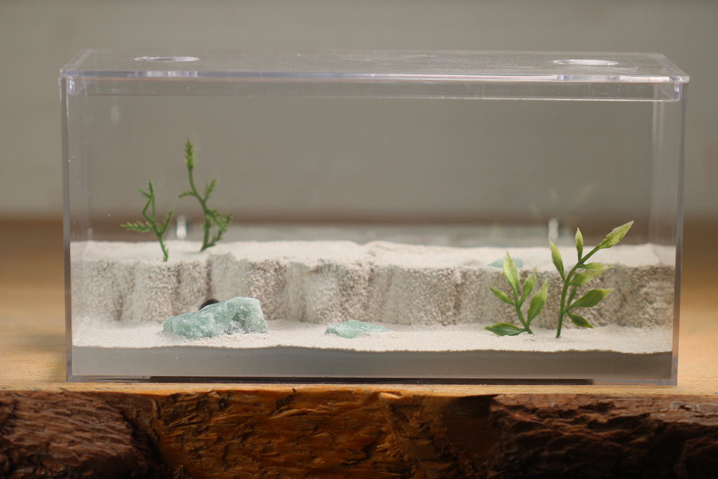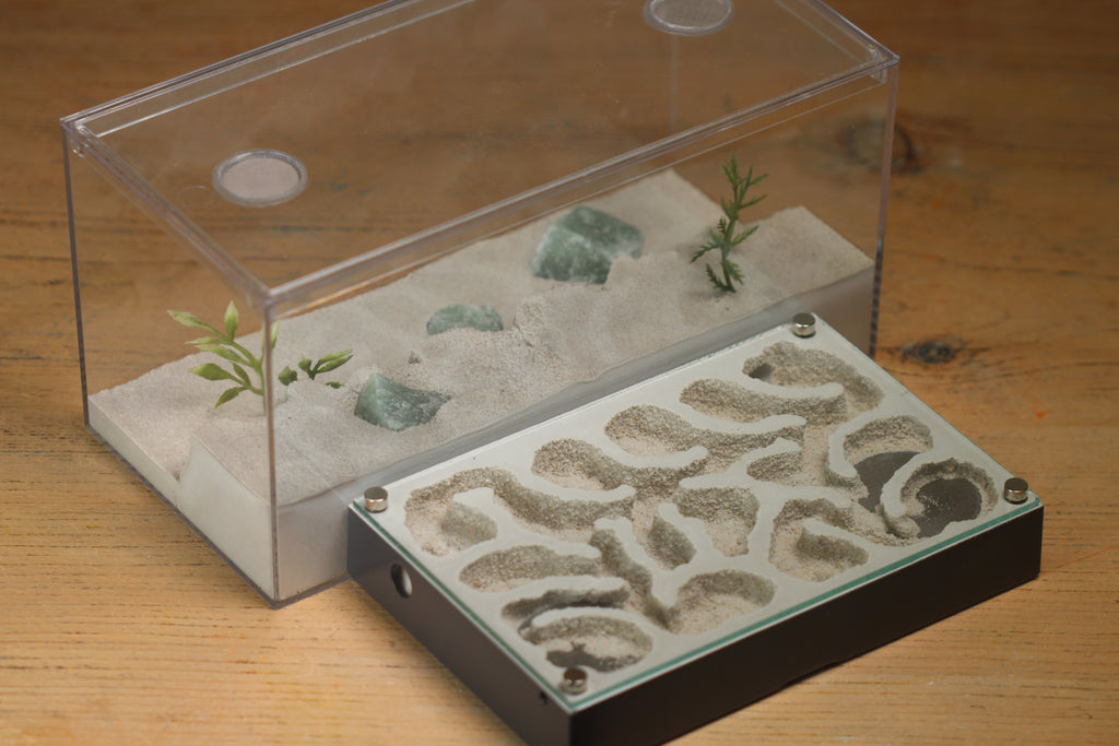 This smaller version of the Labyrinth formicarium.  The Mini Labyrinth formicarium is a 4"x6" (100mmx150mm) formicarium attached magnetically (as well as by a small vinyl tubing insert) to the accompanying foraging area.  The nest is completely removable from the foraging area for easy maintenance.