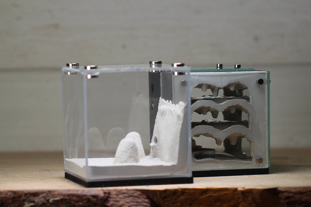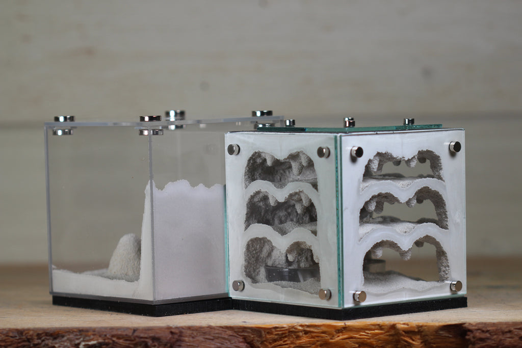 Camponotus spp. - Larger ants typically, our colonies have always utilized the ceilings of formicaria to hang upside-down. This design provides two larger 4x4 caverns for this activity and 4 viewing sides to view these ants hanging from.