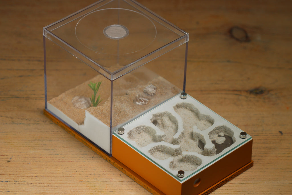 The Fallen Fortress is a new formicarium design from Tar Heel Ants.  This design for your ant colonies features a 4x4x4" foraging area magnetically attached to the back of a 4x4x2 inch nest.  This is a very similar design to our popular Fortress formicarium.