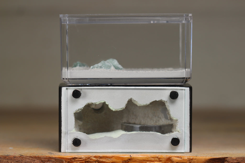 ***GLOW MINI HEARTH - This Mini Hearth has a glow-in-the-dark feature. A special coating on the interior (ant safe) makes this formicarium illuminate when lights are turned off. It is best charged using UV (black) lighting. Normal lighting works as well but to a lesser degree. ***