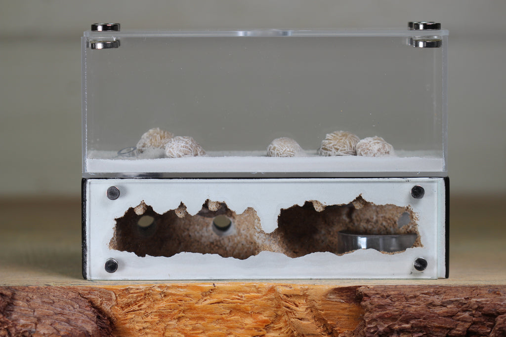 What comes with the Mini Hearth XXL? 2 Nestmates, 3 stoppers (3/8"), Syringe and blunt tip adapter, Feeding Dish